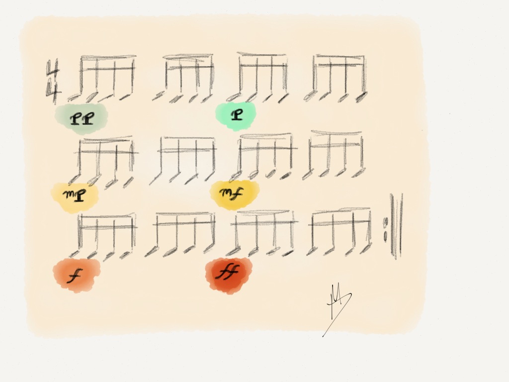 Now that we have memorized our heights/dynamics it’s time to incorporate these in an ascending manner from softest to loudest. Play this exercise slowly at first paying close attention to each height/dynamic. The shift is quick so be careful and be very specific. Once you feel comfortable speed it up and have fun!