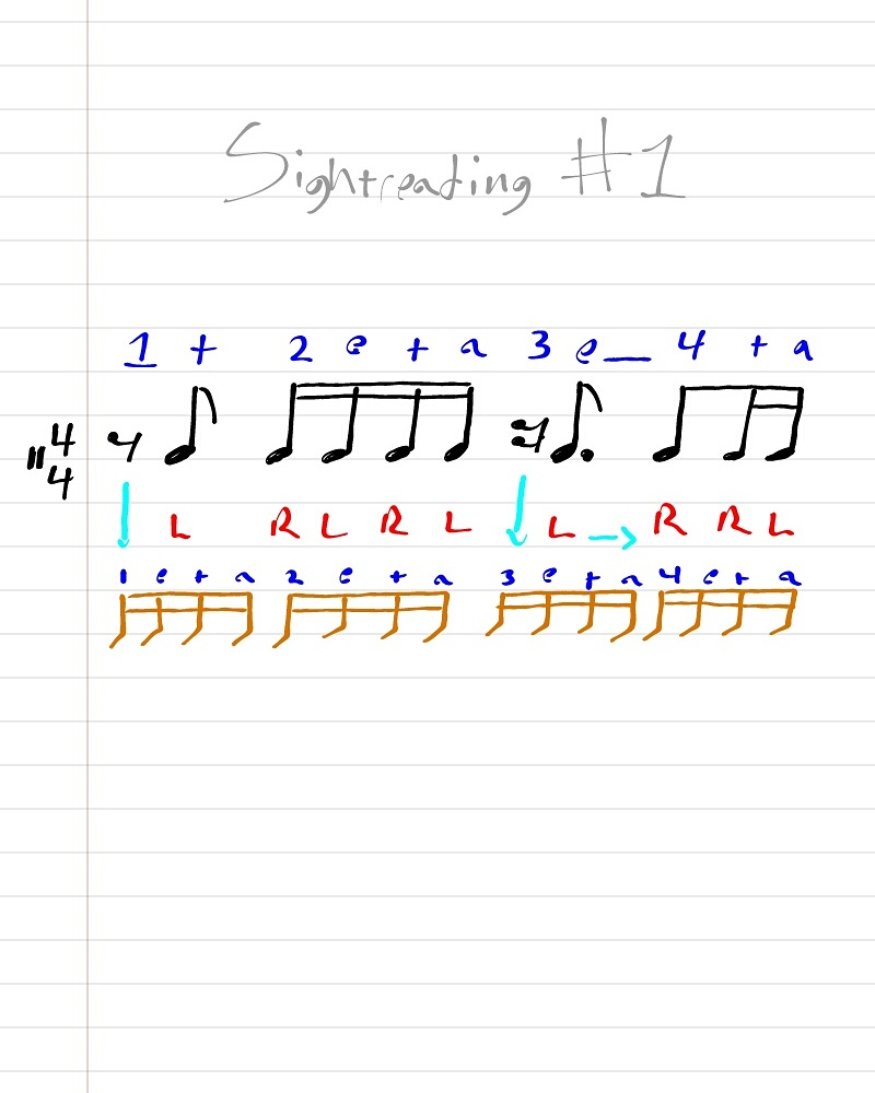 First you have an eighth rest on “1” and come in on the “and” of 1 followed by a full sixteenth set on 2 (2 e +a). Next you have a sixteenth rest on 3 where you immediately come in on the “e” of 3. You must speak the “e” as a longer value since its dotted and holding the duration of “e + a”. Last, a sixteenth note combination spoken and played as “4— + a”. Since the “e” isn’t present you speak the 4 as “fouuuur + a”, holding it to take the place of the “e”.