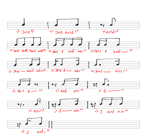 Above I have sketched out different note phrases that you will see along your way ranging from quarter notes to sixteenth notes along with eighth rests, dotted eighth rests, and sixteenth note rests. The objective is of course to first have the proper understanding of each note value and it’s purpose then to speak it.