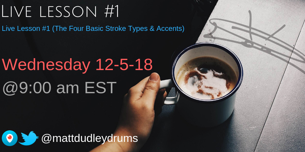 Welcome to live lesson #1! This is the kickstart to a weekly series I am going to start. It’s a chance for me to give back to the drumming community and also a way for us to drum together and build relationships! In this live lesson we will be starting from the foundation of great hand technique… The four basic stroke types. Before you go any farther be sure to download the free PDF’s to follow along…