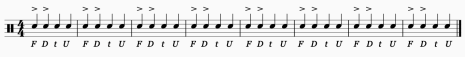 An accent is a stronger attack placed on a particular note or set of notes. Mostly it’s a down stroke which is symbolized by (>) over the top of a note or notes. Use the Stroke Types to set up your hands for the next move on each of these exercises.