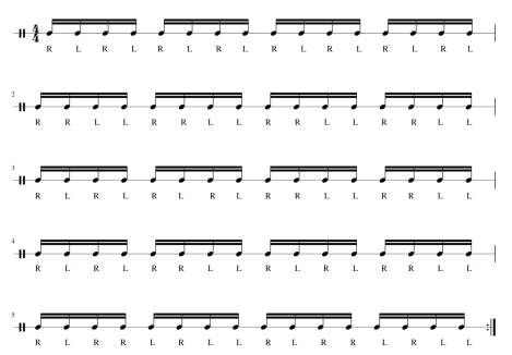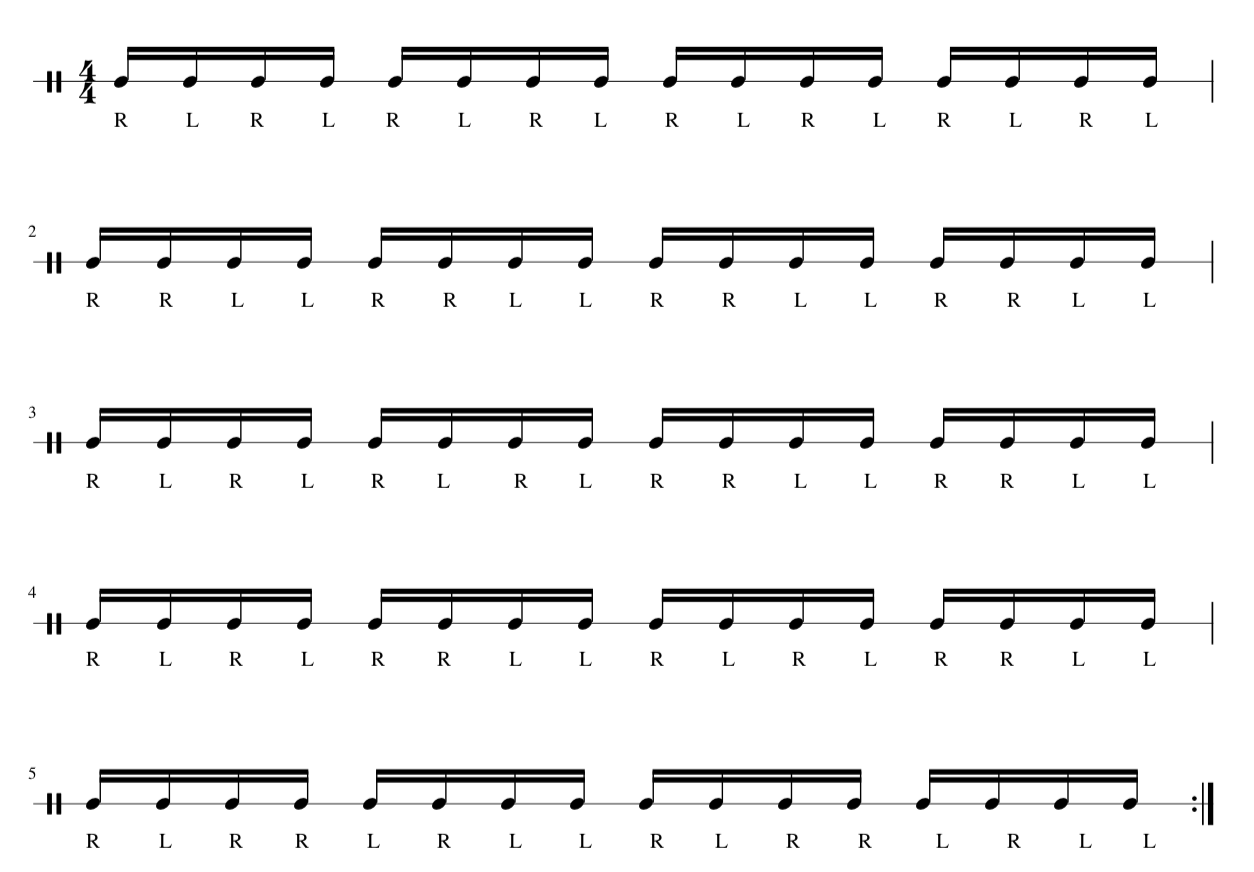 Get a metronome or a metronome app and set the note value to 16th notes. By doing this you will be playing every stroke on every “beep” creating perfect strokes in time. This will help at higher tempos building a solid foundation. Start off at 60 BPM and slowly work on the mechanics, then increase by 10 BPM once you are comfortable.