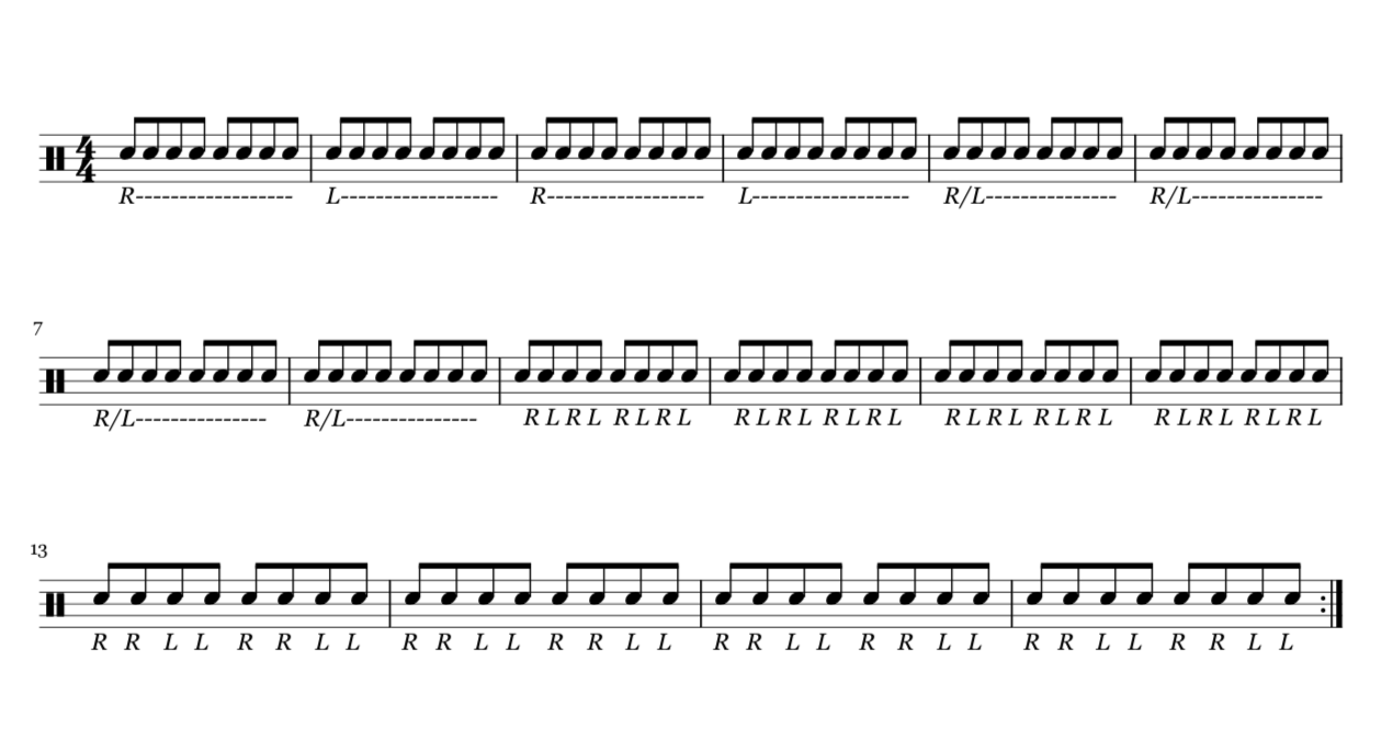Utilizing rebound is important to playing relaxed. In this exercise we will be using a simple concept of hand technique and different sticking patterns to get our hands used to playing relaxed and letting the pad do all the work.