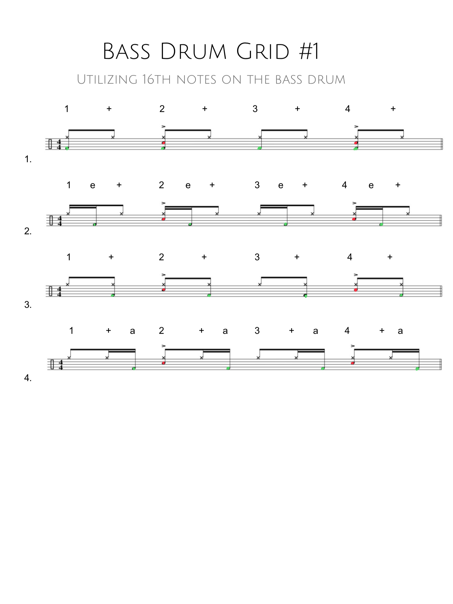 We will be placing the bass drum on the “1”, “e”, “&”, and “ah” while keeping a simple ostinato on the hi hat and snare drum. Take your time with each example and be remember to practice slow! Once you feel comfortable with each groove try playing them each 4 times and moving on to the next without stopping. This will help build your independence and expand your vocabulary behind the kit!